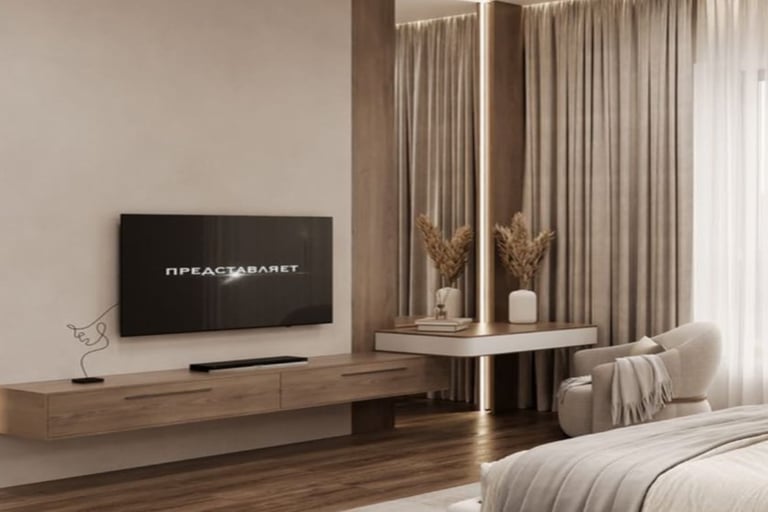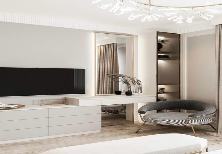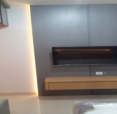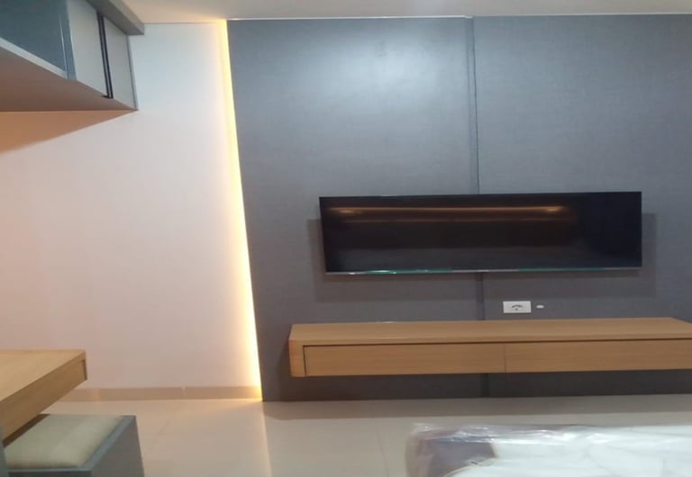 BEDROOM SET dilengkapi dengan tv, meja rias & lemari pakaian ini dirancang untuk memberikan kenyamanan maksimal dengan kombinasi furniture fungsional & estetis.
