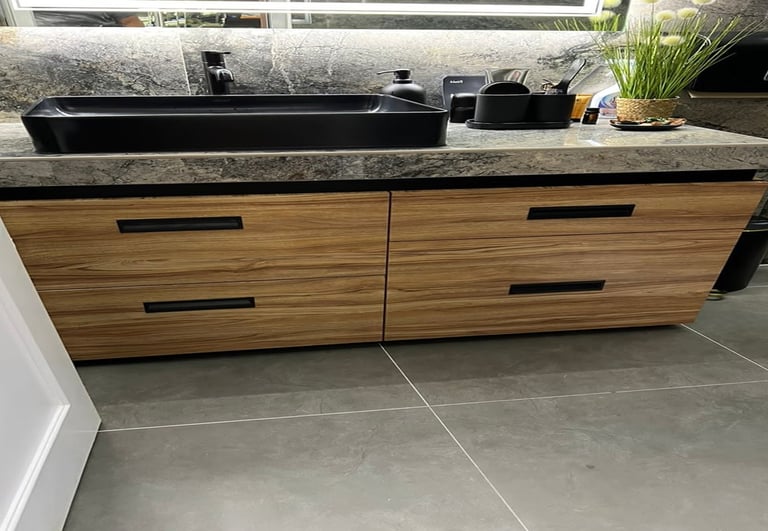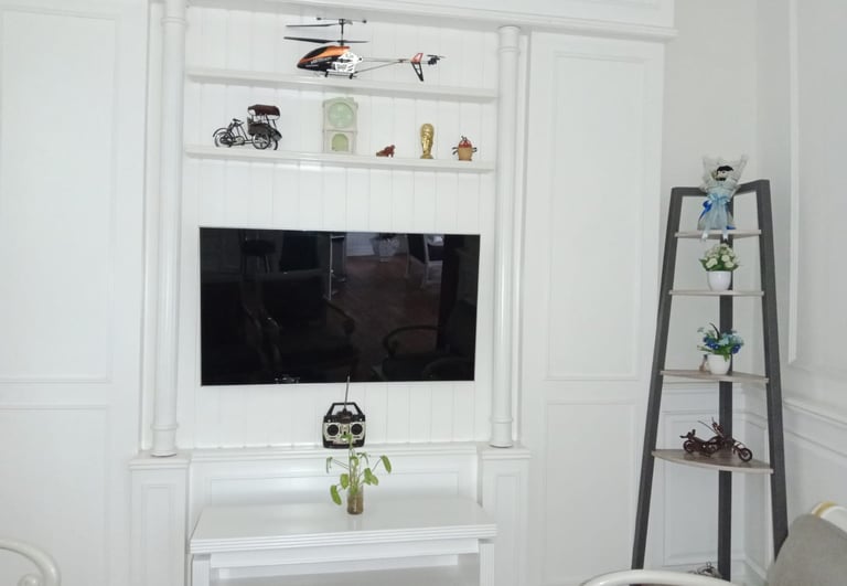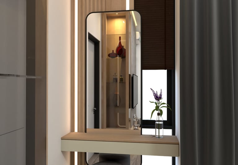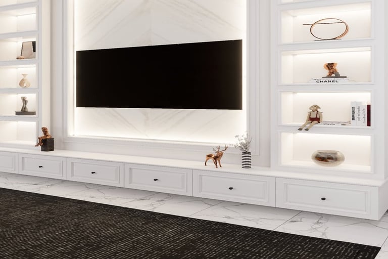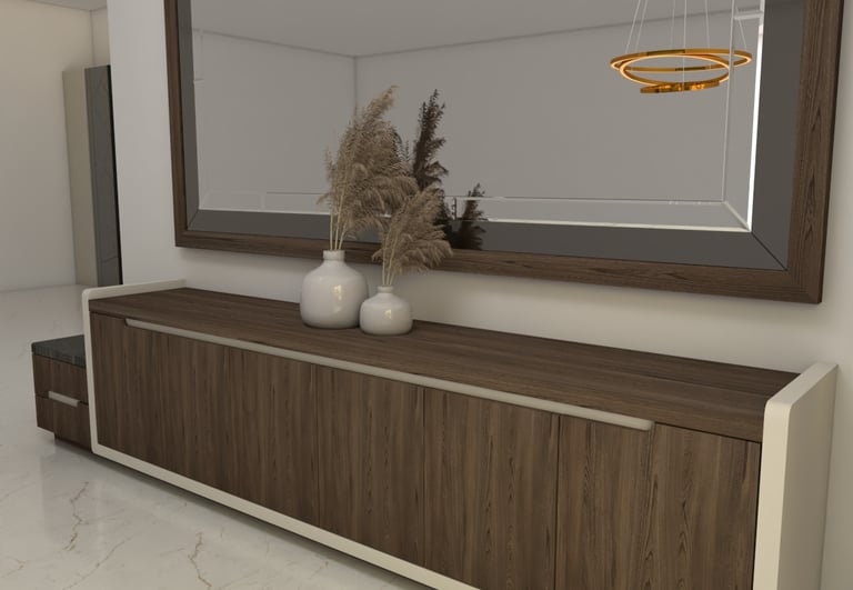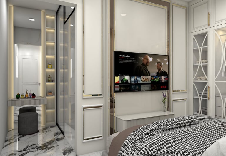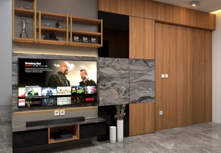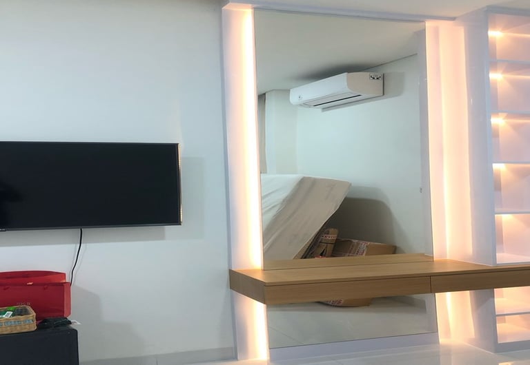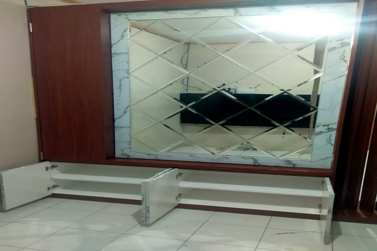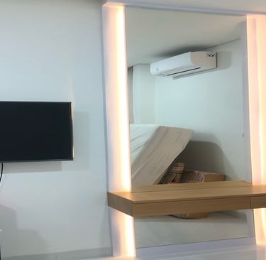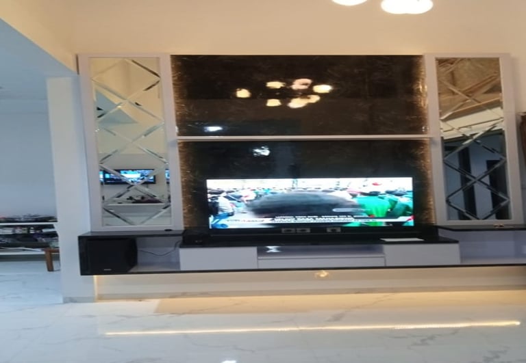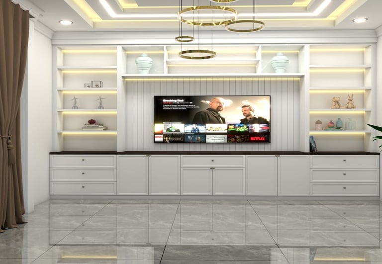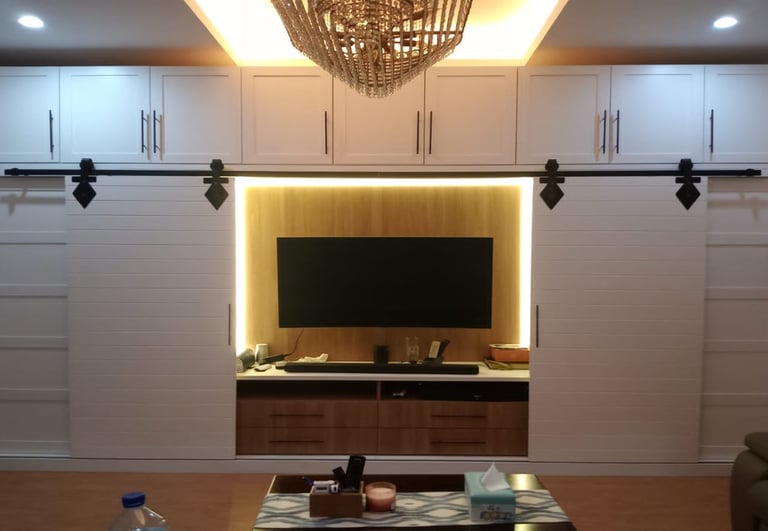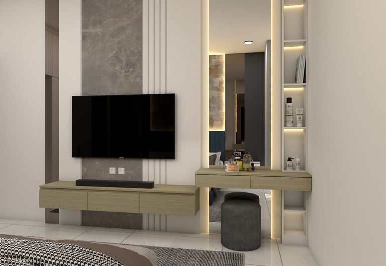 Menggabungkan Kabinet Backdrop TV serta Gradenza dengan Meja Rias.