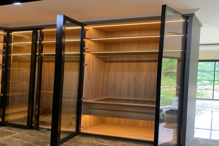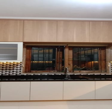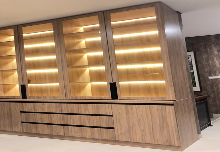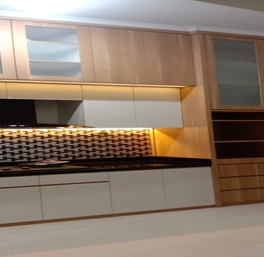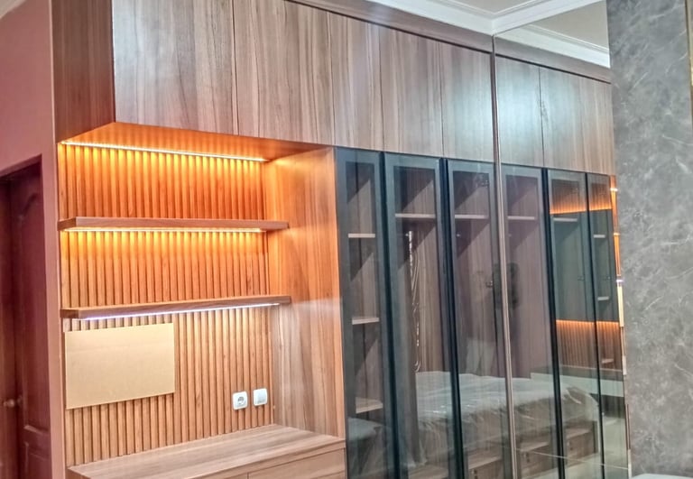Lemari Custom Built-in dengan Sentuhan Kayu dan Pencahayaan Ambient yang dirancang dengan kombinasi material kayu bertekstur vertikal dan kaca transparan. Bagian rak terbuka dilengkapi dengan lampu LED menjadi lebih fungsional sekaligus estetis.