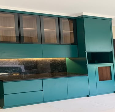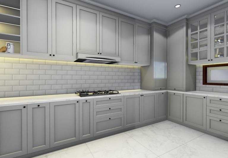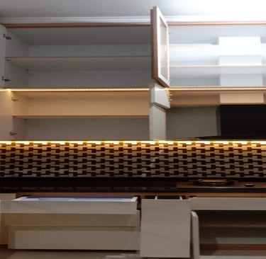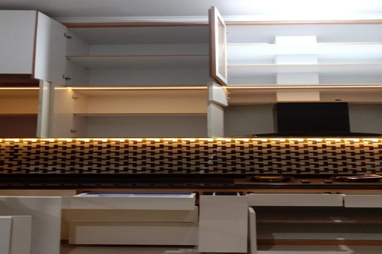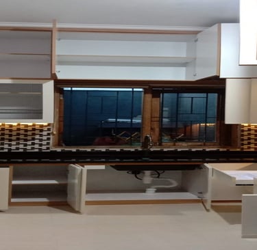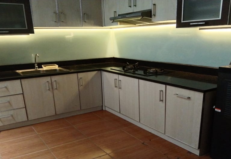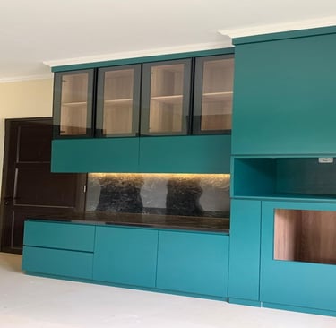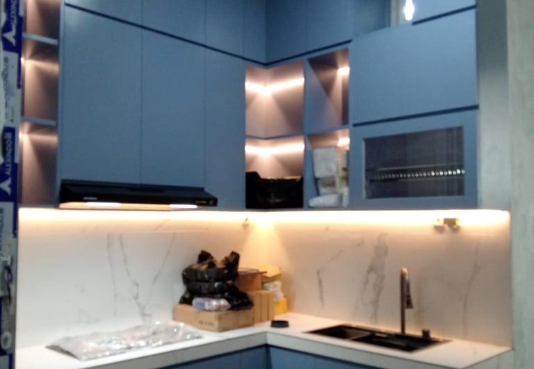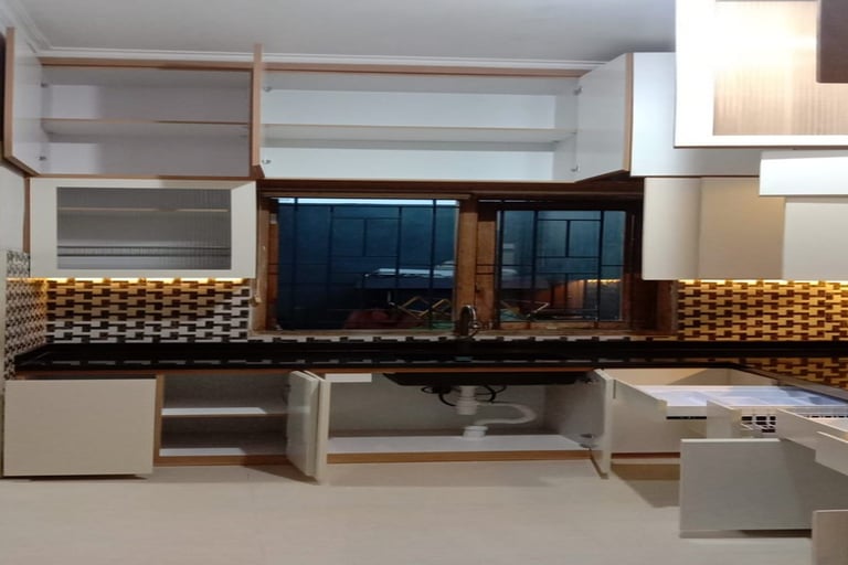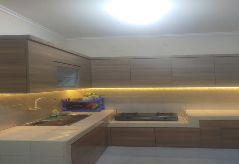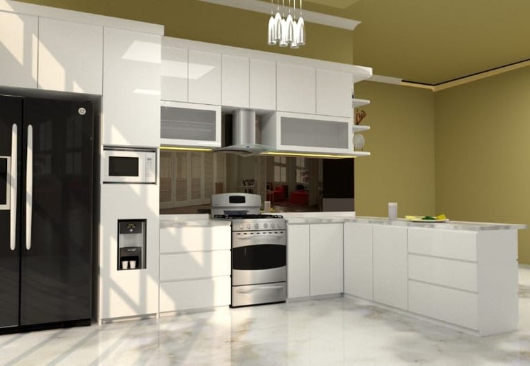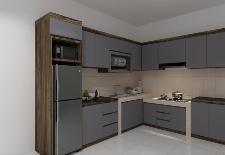 KITCHEN SET L -Shaped adalah bentuk menyerupai huruf L, memanfaatkan dua sisi dinding untuk area memasak dan penyimpanan.