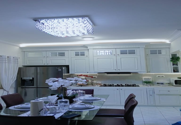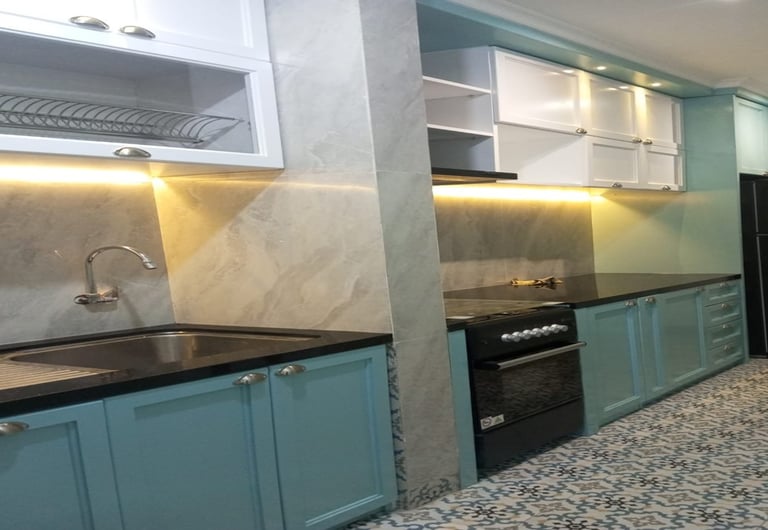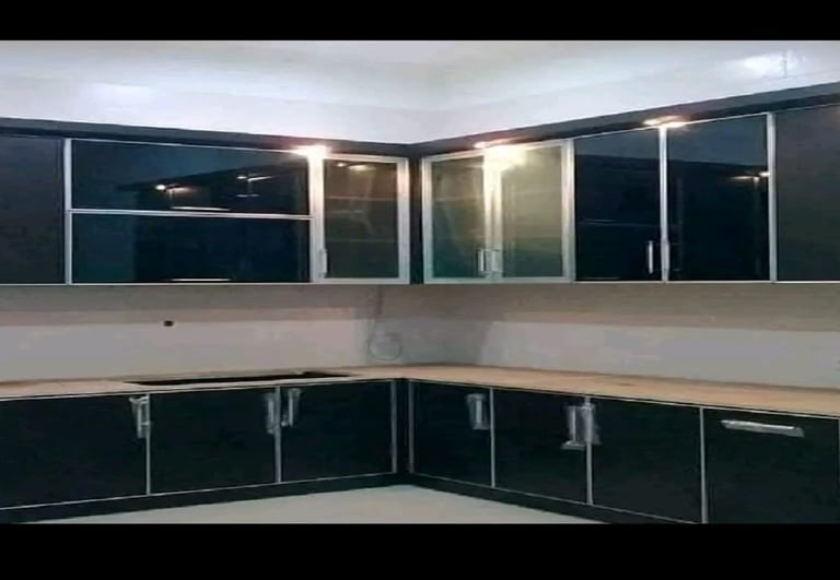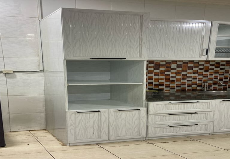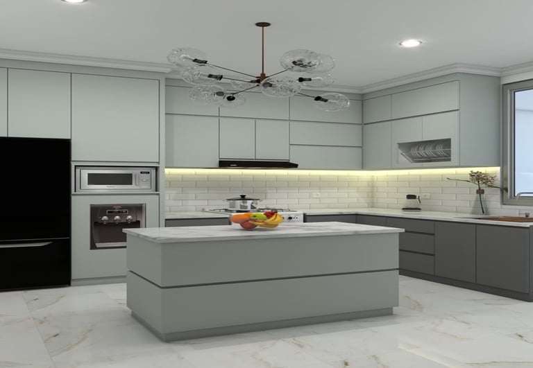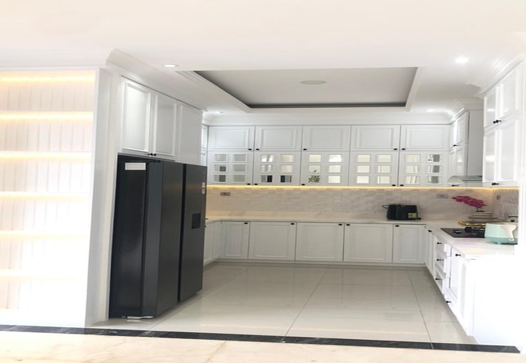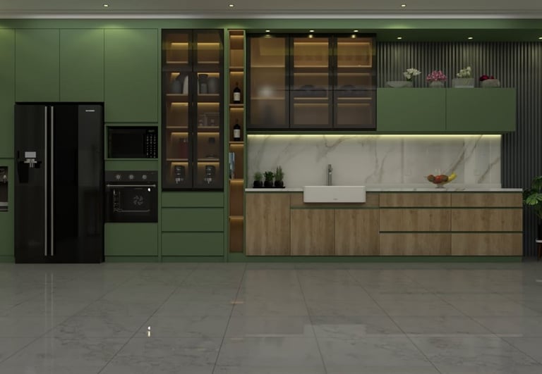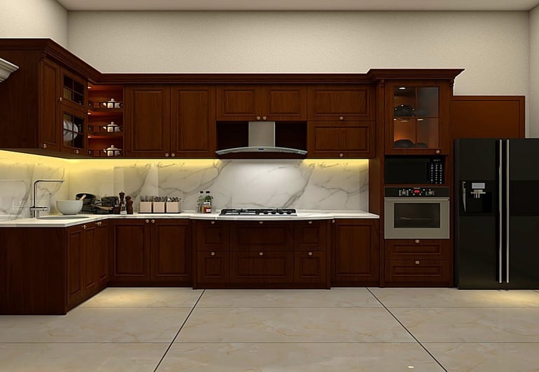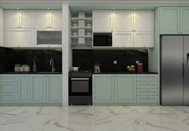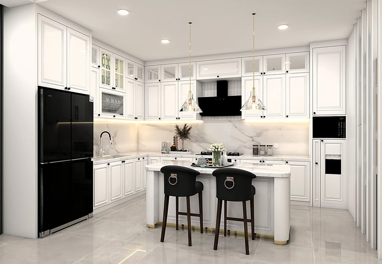 KITCHEN SET L -Shaped adalah bentuk menyerupai huruf L, memanfaatkan dua sisi dinding untuk area memasak dan penyimpanan.