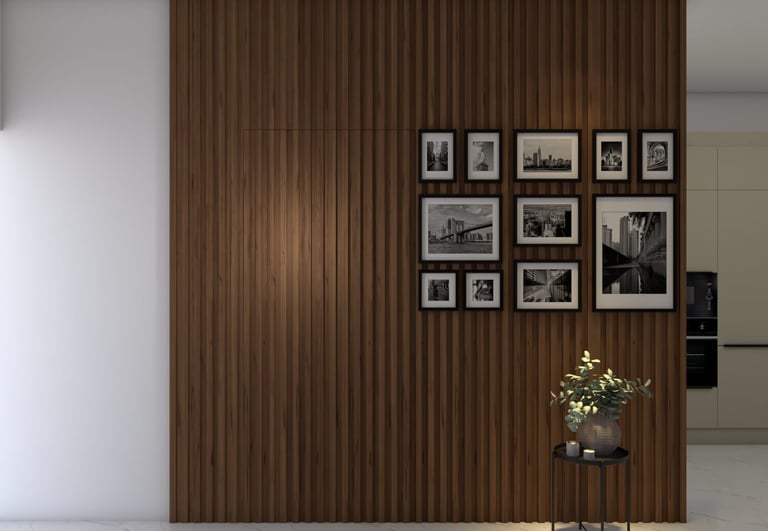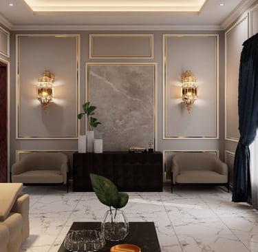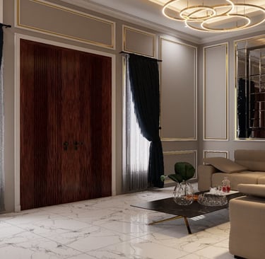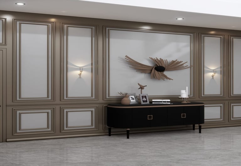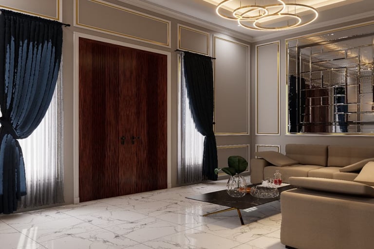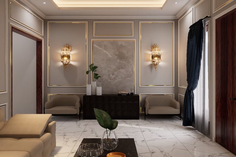 Area Foyer atau Lorong masuk dengan desain klasik modern yang elegan dan simetris, desain dinding menggunakan panel molding klasik dengan kombinasi warna.