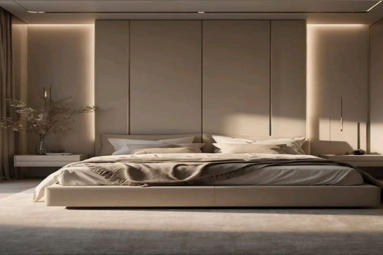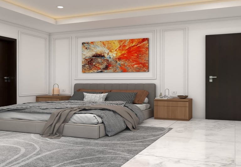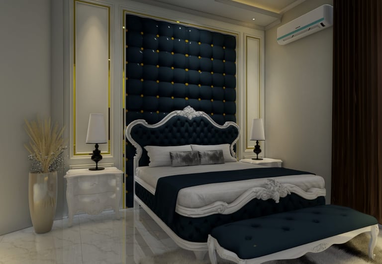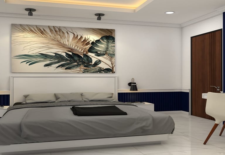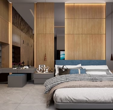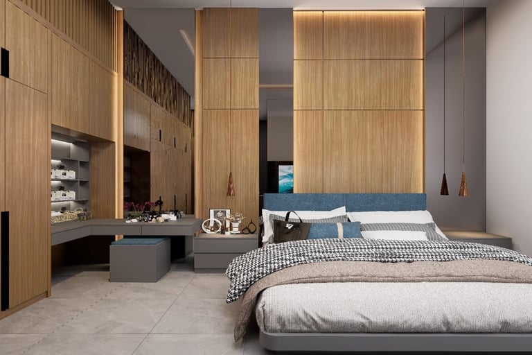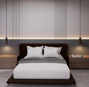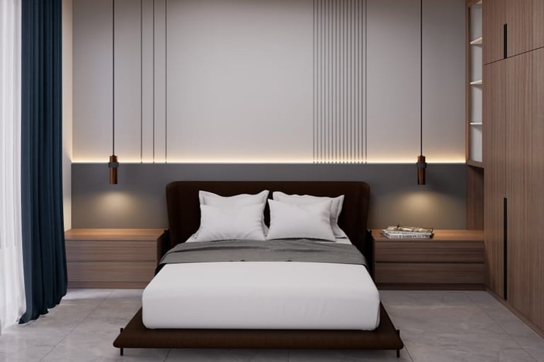 Desain Interior Kamar tidur modern, yang menggabungkan nuansa maskulin dan elegan.