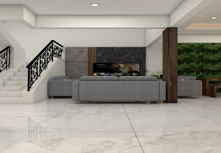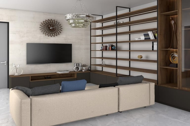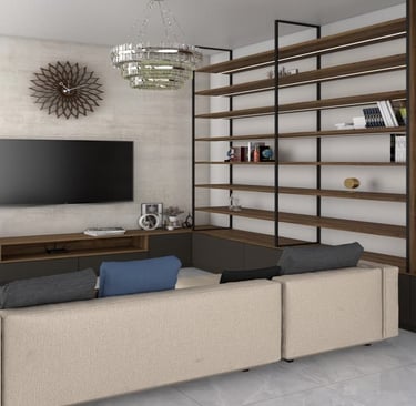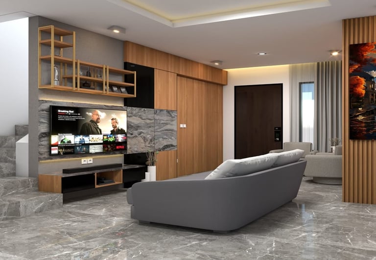 Ruang Keluarga modern dengan nuansa elegan dan tata letak yang fungsional.