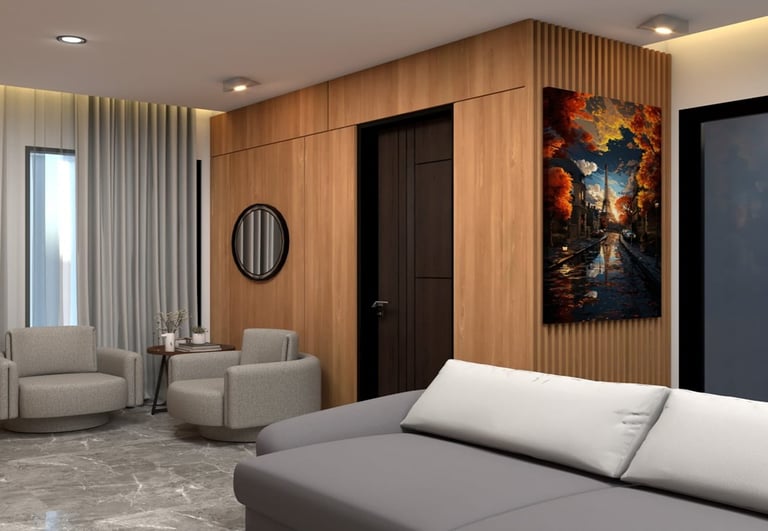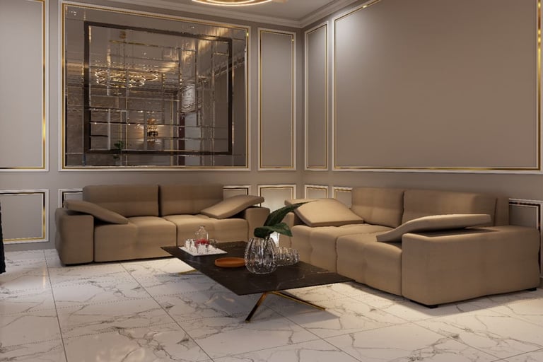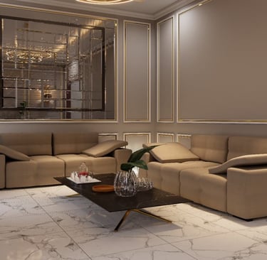 Desain ruang tamu modern dengan nuansa hangat dan elegan.