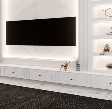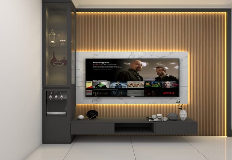 Ruang TV modern dan minimalis dengan estetika yang elegan dan rapi, disisi kiri ada rak kaca vertikal yang dengan pencahayaan dalam ( lampu LED ), menampilkan beberapa hiasan seperti vas dan ornamen kaca, bagian bawah rak terdapat dispenser air yang terintegrasi dalam kabinet, menciptakan solusi fungsional yang tetap estetis.