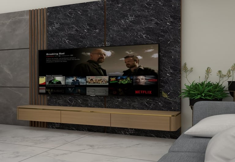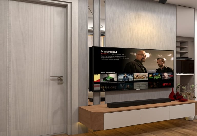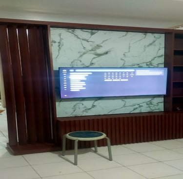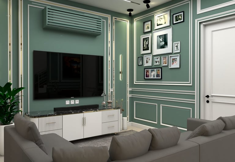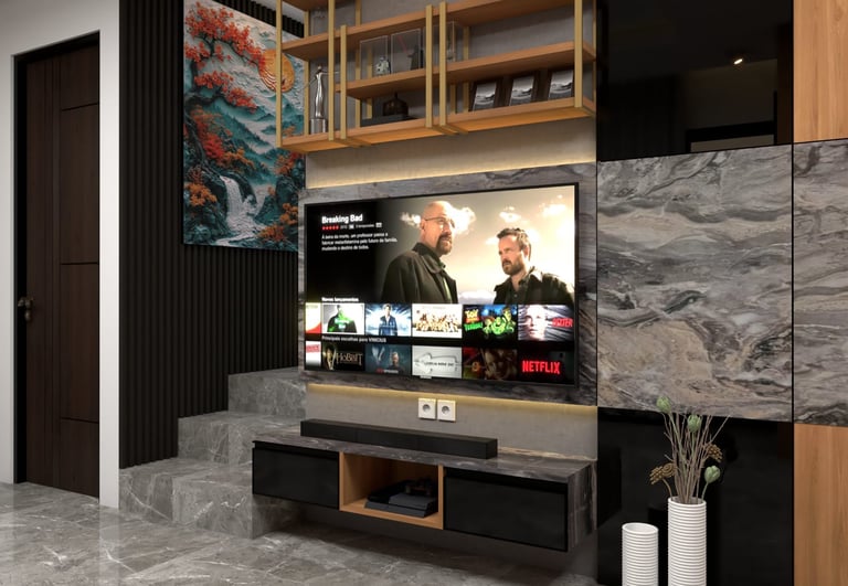 Area TV dengan desain Backdrop elegan dan modern disebuah ruang keluarga.