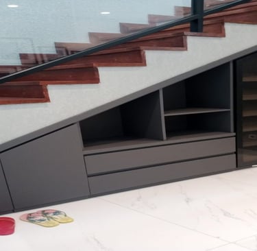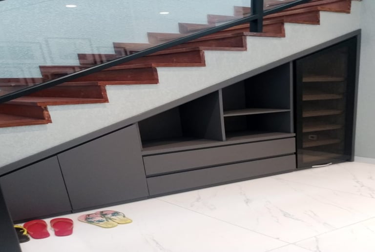 Memanfaatkan bawah tangga untuk tempat penyimpanan barang.