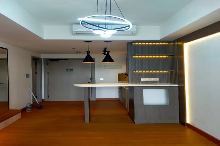 Kitchen set dan backdrop tv yang dibatasi dengan partisi cocok untuk ruang apartemen studio