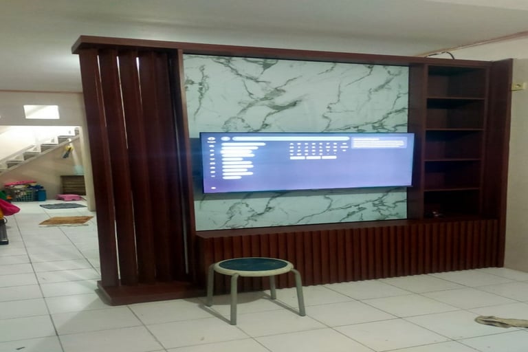 Partisi yang berfungsi sebagai backdrop tv yang dilengkapi dengan ambalan-ambalan,