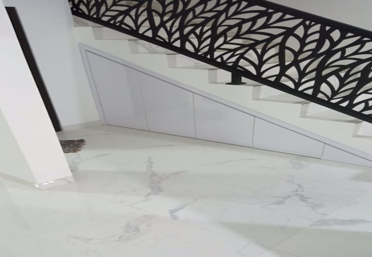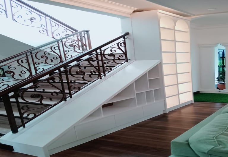 Memanfaatkan bawah tangga sebagai tempat penyimpanan barang atau rak penyimpanan.