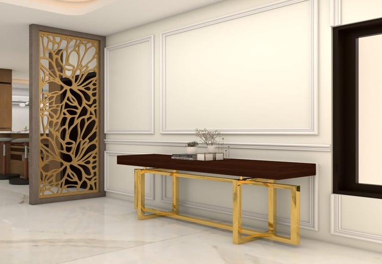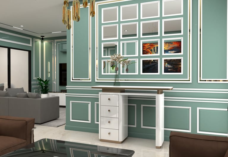 Ruangan yang menggabungkan molding dan ornamen yang dilengkapi meja hias menjadikan ruangan menjadi lebih simple.