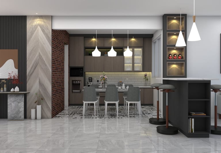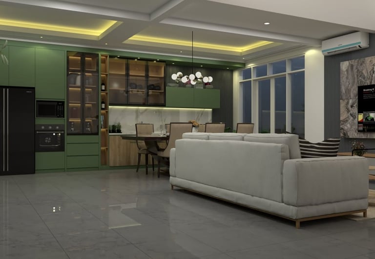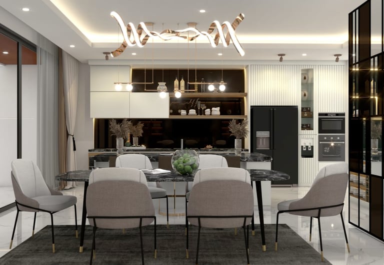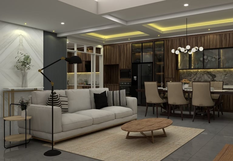 Desain Interior Ruang Tamu dan Ruang Makan Mewah Bergaya Modern.