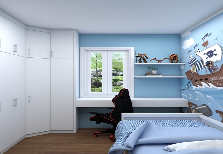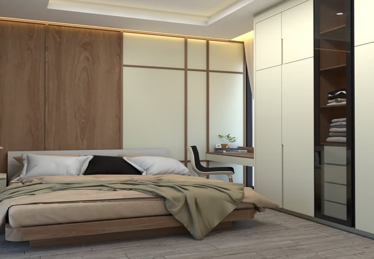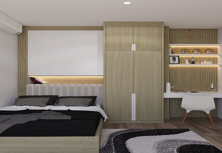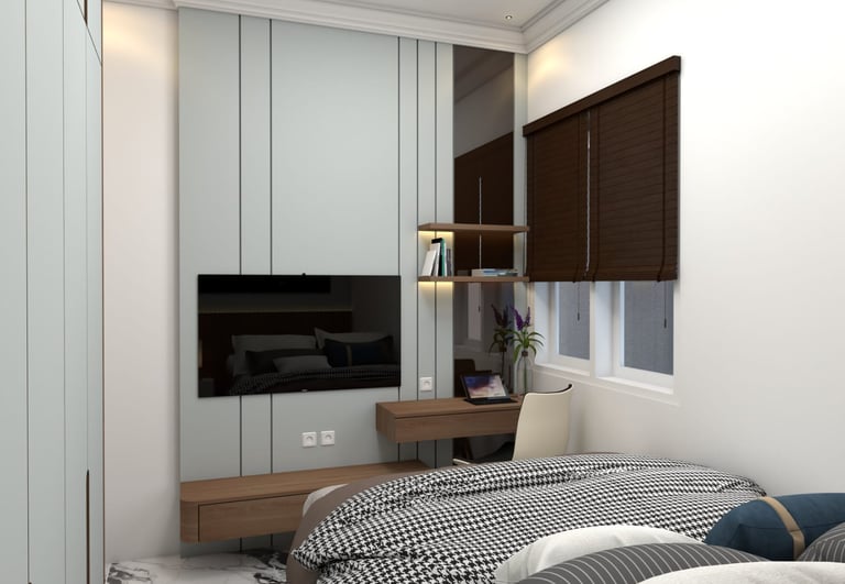 Desain Kamar Tidur Multifungsi Bergaya minimalis modern, yang menggabungkan area istirahat dan area kerja dalam satu ruangan secara efisien.