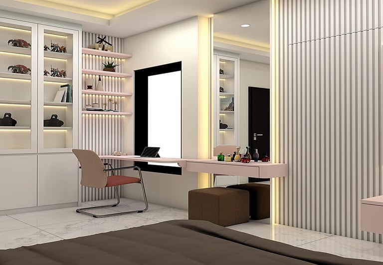 Desain Area Kerja Minimalis Modern yang tertata rapi di dalam ruangan bagian dari kamar tidur atau study pribadi.