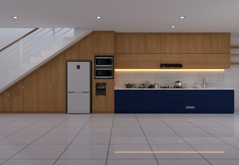 Memanfaatkan bawah tangga sebagai kabinet yang terhubung dengnan kitchen set.