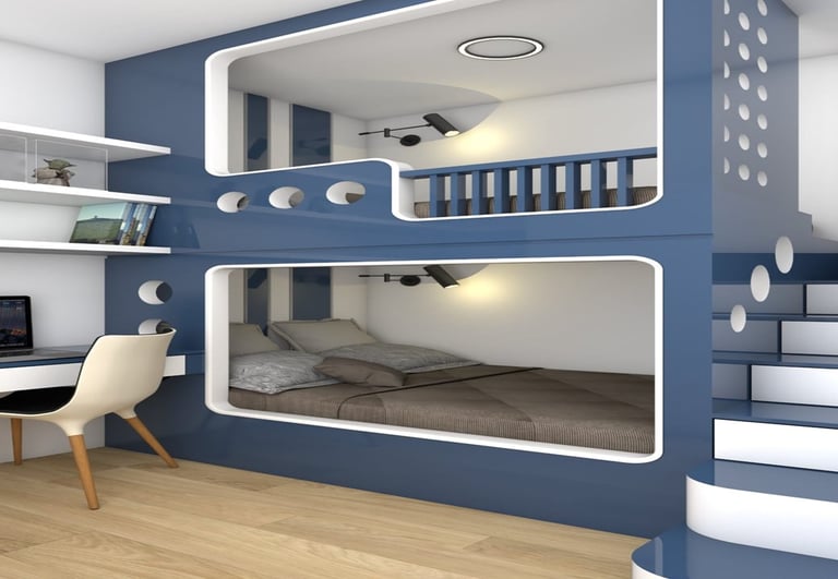 Desain kamar tidur anak atau remaja dengan konsep tempat tidur bertingkat (bunk bed) yang modern dan fungsional.