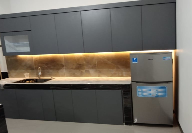 KITCHEN SET single line (I-Shaped) adalah susunan kabinet dan meja dapur dalam satu garis lurus, cocok untuk dapur kecil.