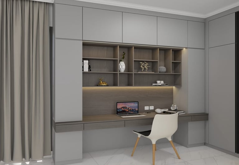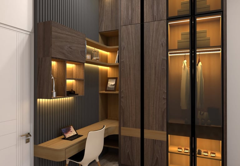 Meja Kerja yang didesain menyatu dengan lemari pakaian dan penyimpanan barang lainnya.