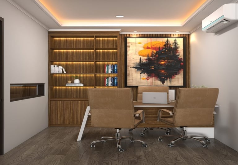 Ruang kerja eksekutif modern yang elegan dan tertata rapi, cocok digunakan untuk keperluan profesional seperti ruang konsultasi atau home office pribadi.