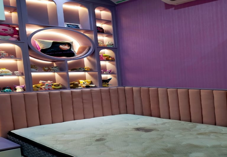 Ruang kerja didalam kamar tidur yang dilengkapi dengan lemari hias didalamnya ada lampu LED menambah kesan estetik.