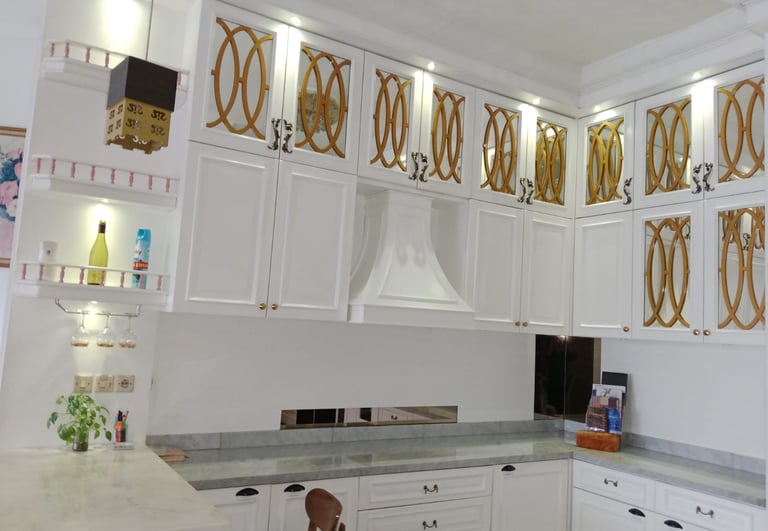 DAPUR KLASIK yang dipadukan dengan warna putih dan keemasan menjadikan kesan lebih mewah dan elegan.