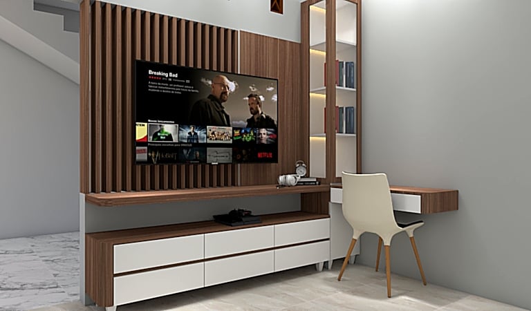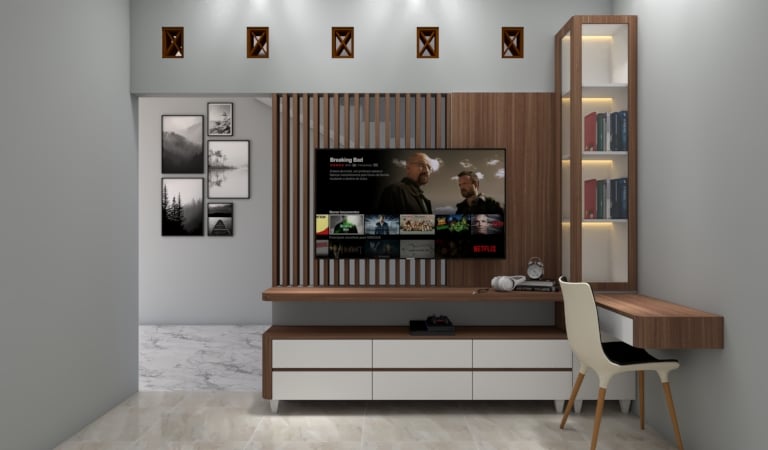 BACKDROP TV yang menyatu dengan lemari penyimpanan dan meja kerja membuat ruangan menjadi lebih simple.