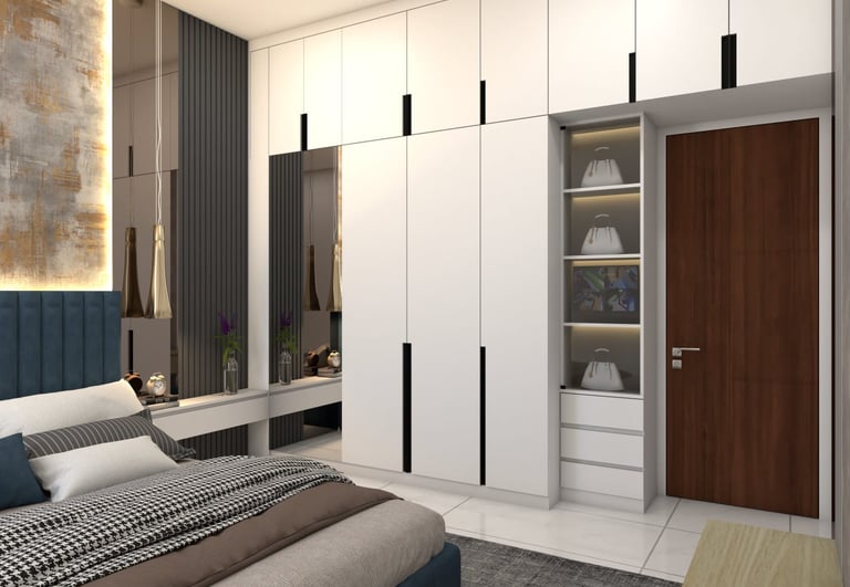 Lemari Pakaian Modern Built-in yang ditempatkan disudut ruangan.